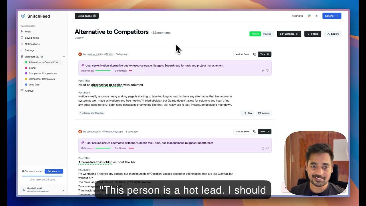 Every day, potential customers discuss their problems on Reddit, X, LinkedIn, and Bluesky. Most companies miss these conversations. SnitchFeed finds them for you in real-time, so you can reply before your competitors and close more deals.